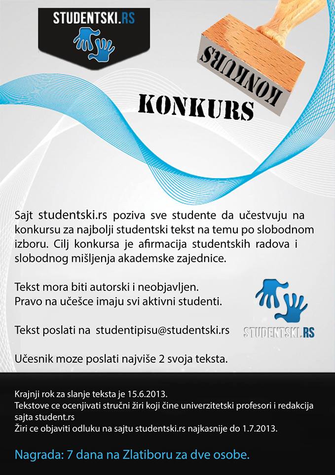 Sajt studentski.rs poziva sve studente da učestvuju na konkursu za najbolji studentski tekst na temu po slobodnom izboru. Cilj konkursa je afirmacija studentskih radova i slobodnog mišljenja akademske zajednice. Učesnik može poslati najviše dva svoja teksta. Tekst mora biti autorski i neobjavljen. Pravo na učešće imaju svi aktivni studenti.