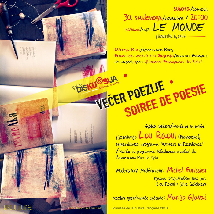 U sklopu manifestacije Dani francuske kulture, 30. studenog u 20:00 u kavani Le Monde (Plinarska 6 , Split), bit će predstavljena francuska pjesnikinja Lou Raoul.