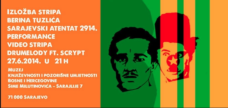 Povodom obilježavanja stogodišnjice Sarajevskog atentata, Muzej književnosti i pozorišne umjetnosti Bosne i Hercegovine i VIA MEDIA pozivaju 27.6.2014. (petak) u 21:00 sat na izložbu stripa Berina Tuzlića “SARAJEVSKI ATENTAT 2914” – performance video stripa drumelody ft scrypt.
