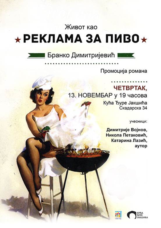 Promocija duhovitog epistolarnog romana ‘’Život kao reklama za pivo’’ Branka Dimitrijevića (Čarobna knjiga, 2014) na kojoj će osim autora, govoriti Dimitrije Vojnov, scenarista i Nikola Petакović, urednik u Čarobnoj knjizi, održaće se u četvrtak, 13. novembra od 19h u Kući Đure Jakšića.