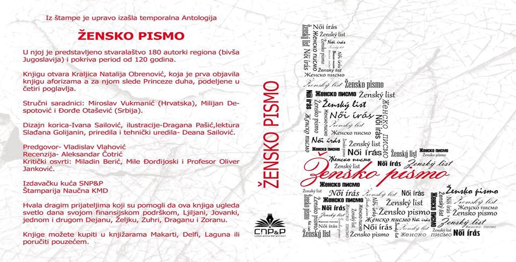 U državama koje pate od porođajnih bolesti aforizam je najbolji način da se sa malo, kaže puno. Da veliki čuju male, čiji su najbolji i najdosljedniji potparoli aforističari. Ovdje gdje se aforističarska scena razliva kao rijeka u vrijeme poplave, iz nekog razloga postoji fama da žene isuviše pričaju, te da se stoga teško uklapaju u kratke forme, što ih dovodi u stanje u kojem je maltene nemoguće ispoštovati osnovni postulat aforizma – kratko i jasno. Stoga govorim – kratko i jasno, vrsna aforističarka Deana Sailović predvodnica novog vala srpske aforistike, uspjela je na briljantan način da takvu hipotezu opovrgne, odnosno baci u vodu i to jednim jedinim udarcem nazvanim „Žensko pismo“.
