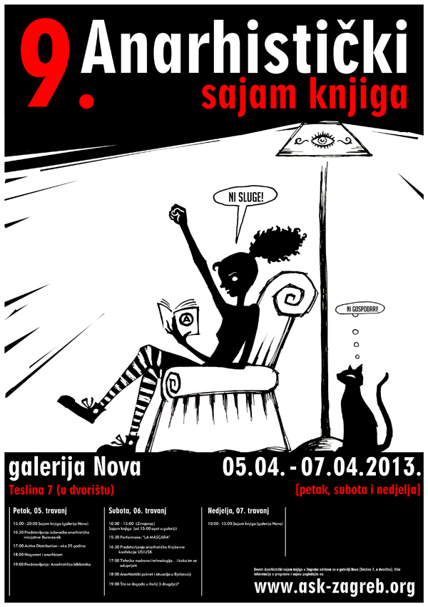 Deveti Anarhistički sajam knjiga u Zagrebu održat će se od 5 do 7. travnja 2013. godine u galeriji Nova u Teslinoj ulici, a cjelokupan program je dostupan na stranicama sajma www.ask-zagreb.org
